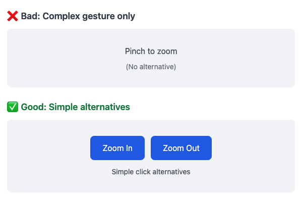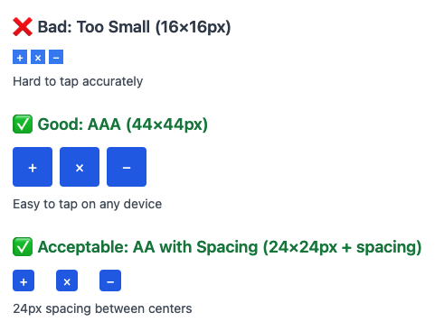 | 1.3.4 Orientation (AA) 1.3.5 Identify Input Purpose (AA) 1.3.6 Identify Purpose (AAA) 1.4.10 Reflow (AA) 1.4.11 Non-Text Contrast (AA) 1.4.12 Text Spacing (AA) 1.4.13 Content on Hover or Focus (AA) 2.1.4 Character Key Shortcuts (A) 2.2.6 Timeouts (AAA) 2.3.3 Animation from Interactions (AAA) 2.5.1 Pointer Gestures (A) 2.5.2 Pointer Cancellation (A) 2.5.3 Label in Name (A) 2.5.4 Motion Actuation (A) 2.5.5 Target Size (AAA) 2.5.6 Concurrent Input Mechanisms (AAA) 4.1.3 Status Messages (AA) |